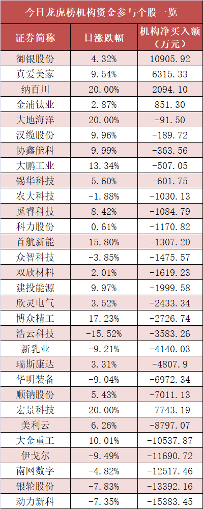 盘后龙虎榜数据显示,机构现身多股,其中御银股份等股票呈现机构资金净买入,动力新科等股票呈现机构资金净卖出。