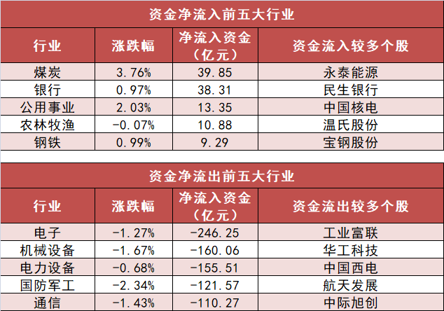 申万一级行业中,9个行业实现资金净流入,其中煤炭行业净流入39.85亿元居首。