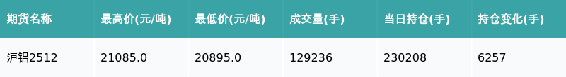 南财智讯10月17日电,南财金融终端盘后期货数据显示,上海期货交易所的沪铝主力合约收跌0.12%,个人配资炒股收盘报20910.0元/吨,日内资金流入1.01亿元。其他相关指标见下表: