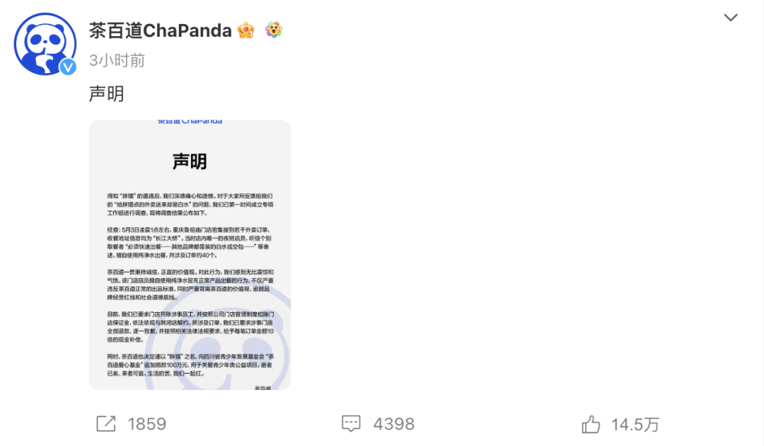 茶百道在今日午后发布声明,对该事件进行详细回应。茶百道表示,5月3日凌晨1点左右,重庆鲁祖庙门店密集接到若干外卖订单,收餐地址信息均为“长江大桥”。当时店内唯一的夜班店员,听信个别取餐者“必须快速出餐……其他品牌都是装的白水或空包……”等表述,擅自使用纯净水出餐,共涉及订单约40个。